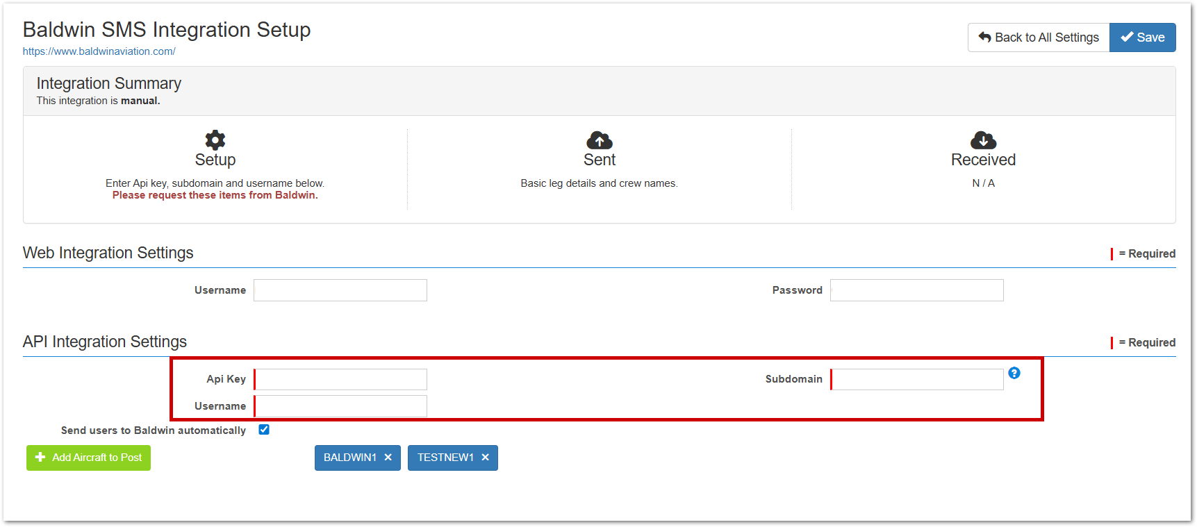 3. Enter in API Key and Subdomain and Username (please request these items from Baldwin)