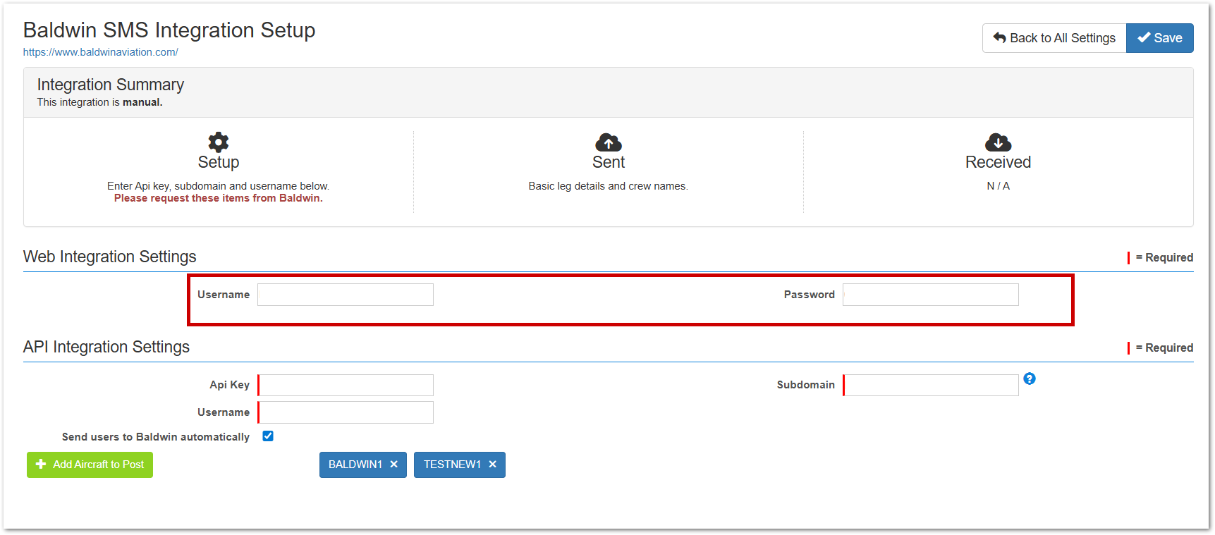 - On the Integrations tab, click on Settings for Baldwin SMS