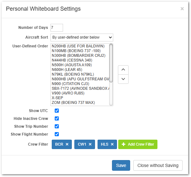 Aircraft Sort Order: Sort by registration number (Alphabetical), or User-Defined order (You set the order)