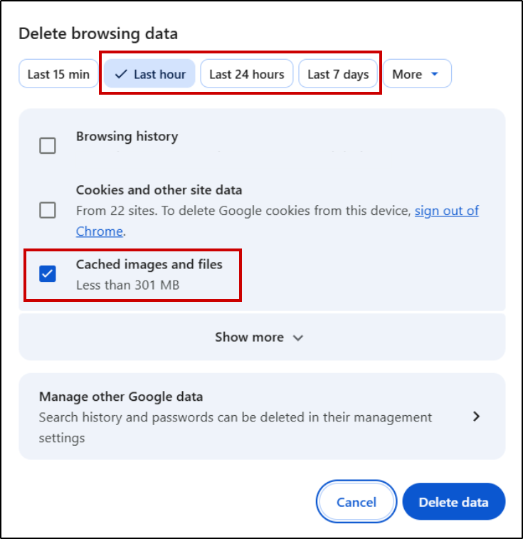 - Select the items you wish to clear: Clear cookies and data or Clear Cookies and Clear Cache.