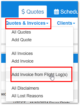 1. Navigate to Quotes tab > Quotes & Invoices> Add Invoice from Flight Log(s)
