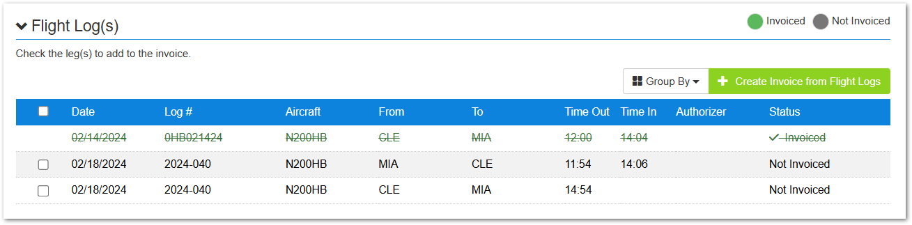 5. Check the checkbox next to each log to be included in the invoice. You can combine any number of logs into a single invoice. For example: a month's worth of trip into one invoice, or just one flight.