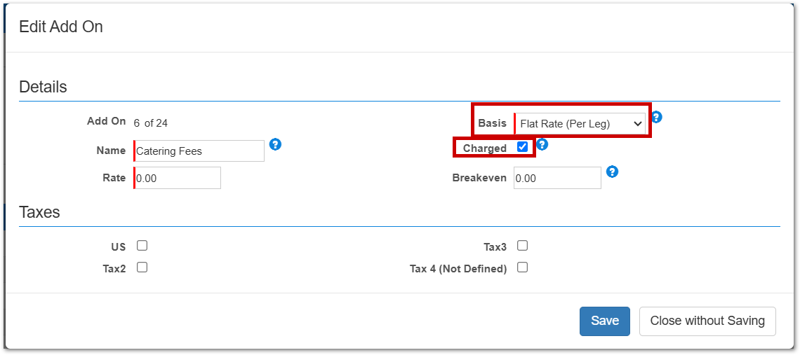 Each aircraft will need to have the Add Ons set to "Charged" with a rate type set.