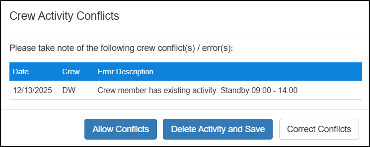 Crew scheduling now supports multiple activities on the same day. Users can save trips even when an existing activity (Standby, partial events, or multiple duties) exists.